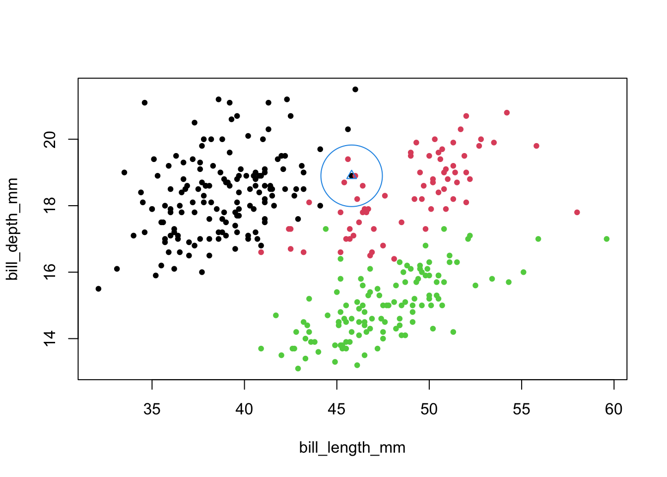 points(penguins[68,c(3,4)],pch=2,col=4,cex=1)