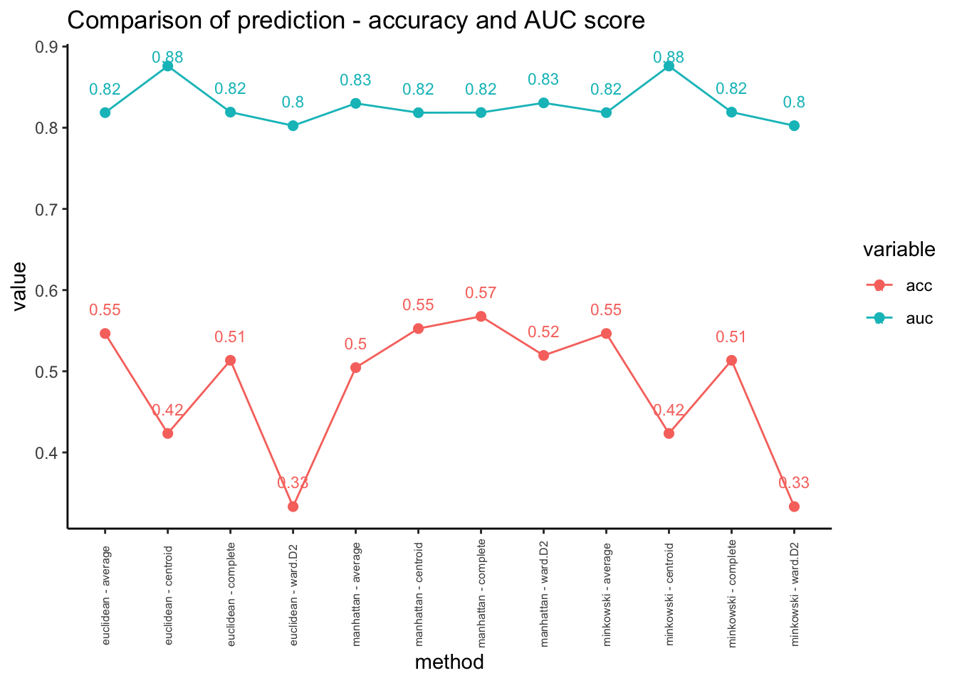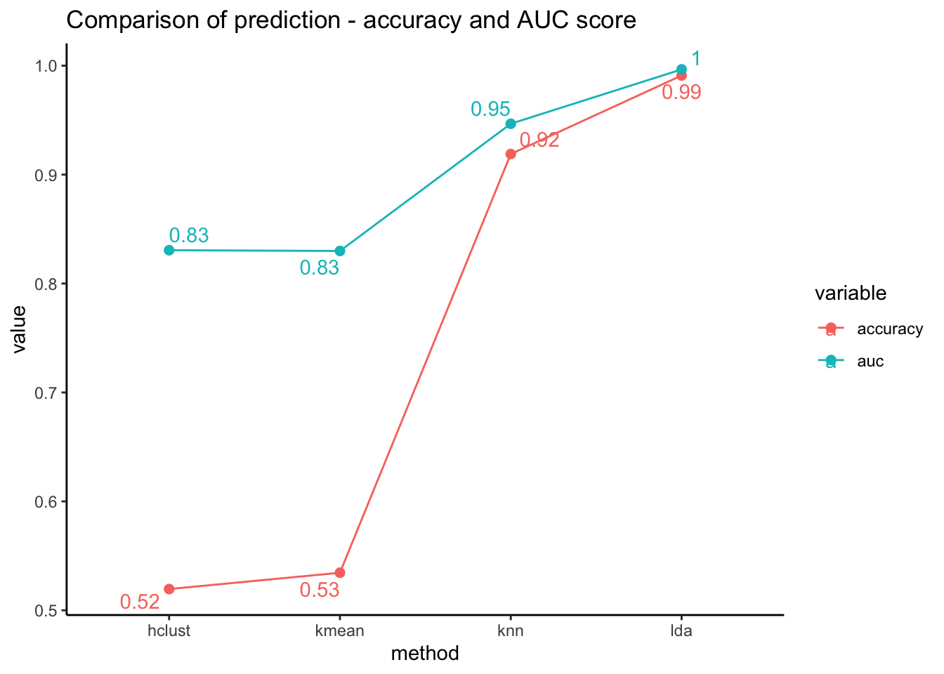 labs(title="Comparison of prediction - accuracy and AUC score")
