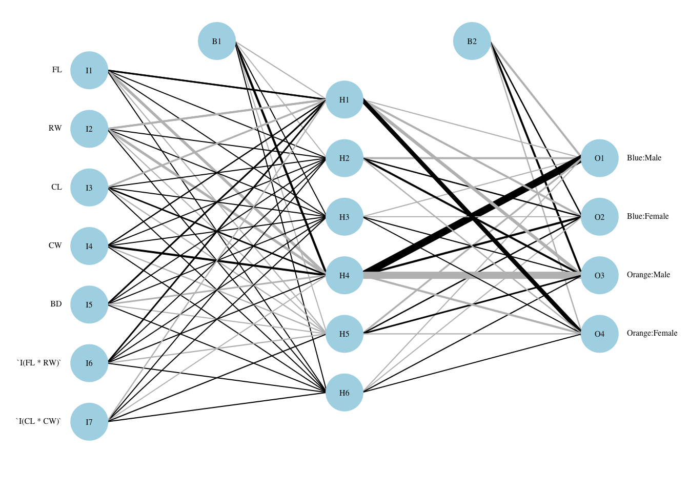 text.nn.crabs.2 <- capture.output(nn.crabs.2 <- caret::train(group~FL+RW+CL+CW+BD+I(FL*RW)+I(CL*CW), data=training, method = "nnet", metric = "Accuracy", trControl = trControl, tuneGrid = tuneGrid, importance = TRUE))