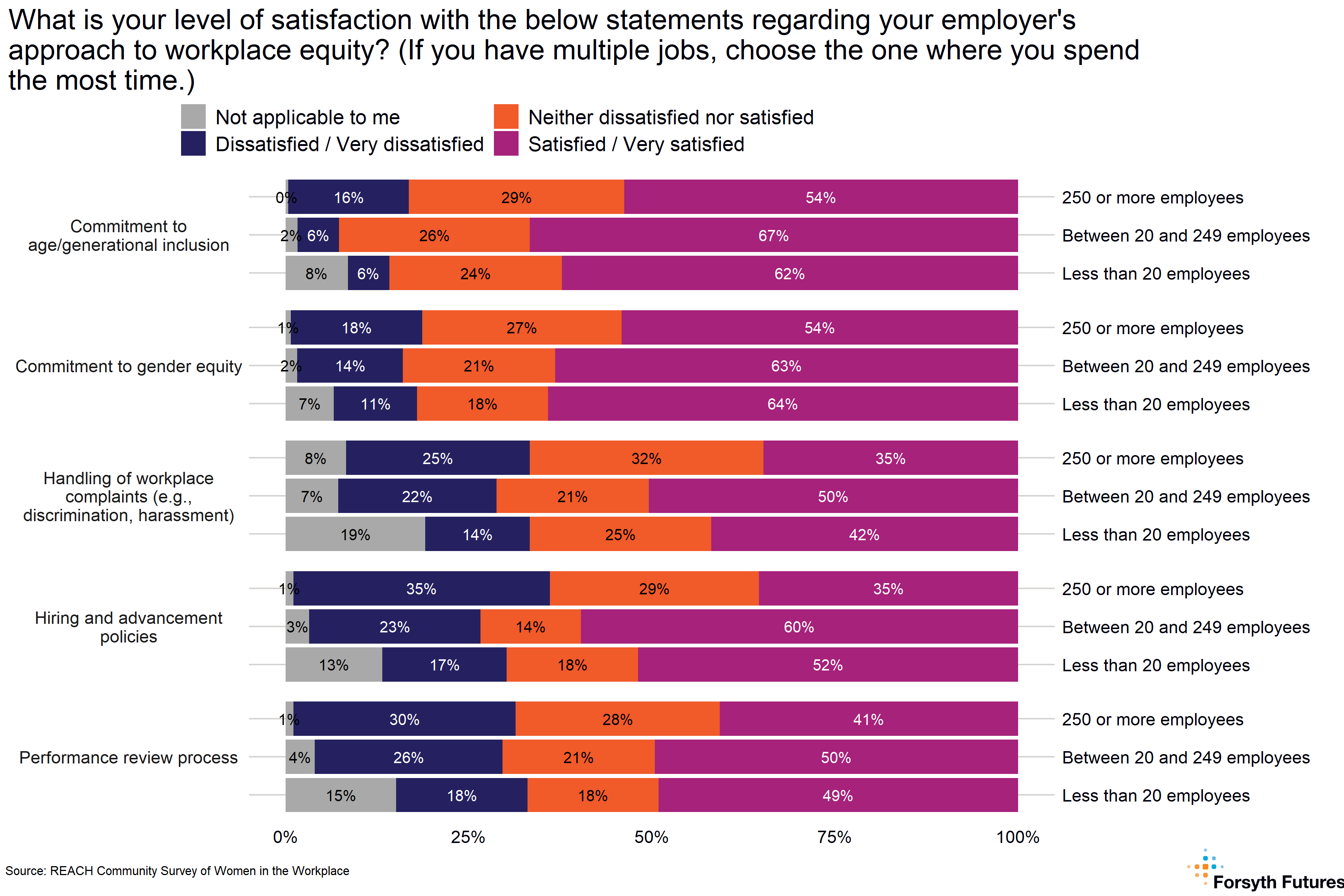 • When rating different aspects of satisfaction with their employers’ commitment to workplace equity, women’s responses varied by all the disaggregations examined except age / generation for commitment to gender equity, handling of workplace complaints, and hiring and advancement policies.