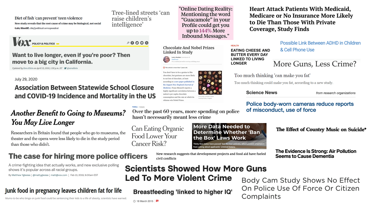 A lot of the above topics suffer from poor design or missing an important confounder (i.e. omitted variable bias).