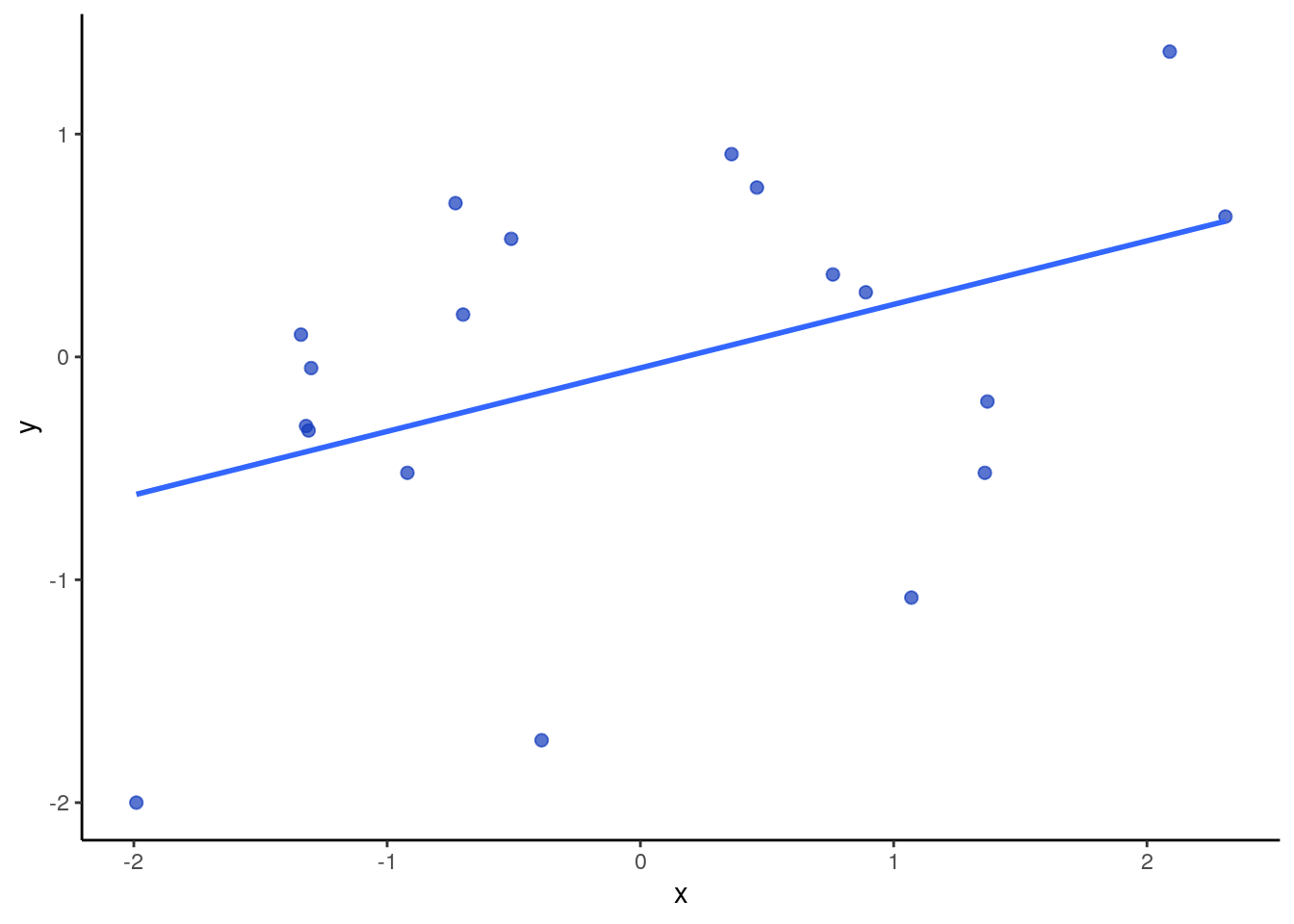 The below image shows a positive correlation of \(r=0.6\), a zero correlation of \(r=0\) and a negative correlation of \(r=-0.6\) for 20 datapoints in each scatterplot.