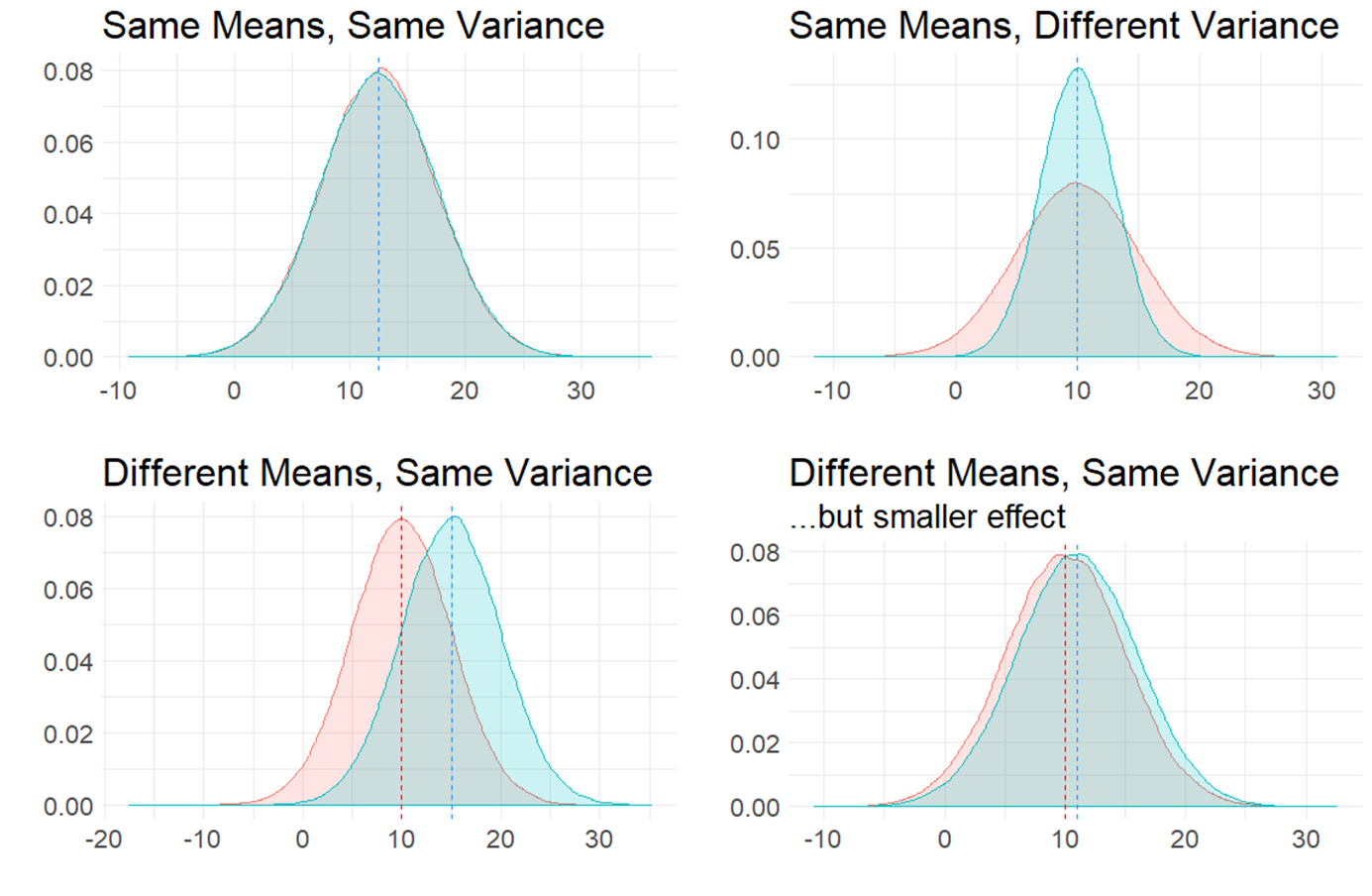 The bottom two distributions show populations with different population means \(\mu\) and the same variance \(\sigma^2\). In the bottom left, the means are quite far apart, whereas in the bottom right the means are different to each other but the effect is much smaller.