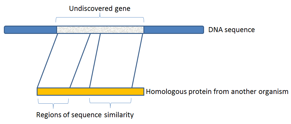 Now, we are going to try to discover a new protein-coding gene on this DNA sequence. In other words, we are going to annotate the naked DNA sequence with the positions of a gene. The underlying principle is that the protein encoded by this gene shares some sequence similarity with already-known proteins. So we are going to search for patches of sequence similarity between our naked DNA sequence and a database of amino-acid sequences from known proteins.
