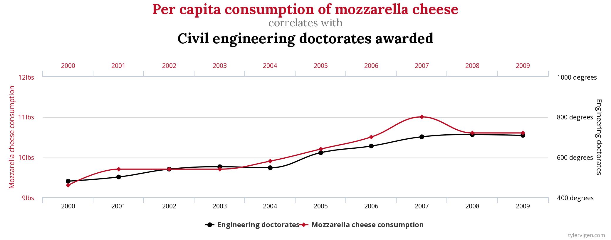Correlation does not imply causation is literally one of the oldest principles in the practice of statistics. It is parroted endlessly in introductory statistics courses by me and people like me. It is absolutely true if we look through enough pairs of variables, we will find some pairs of things that are totally unrelated – like cheese consumption and civil engineering PhD completion – that appear to be connected.
