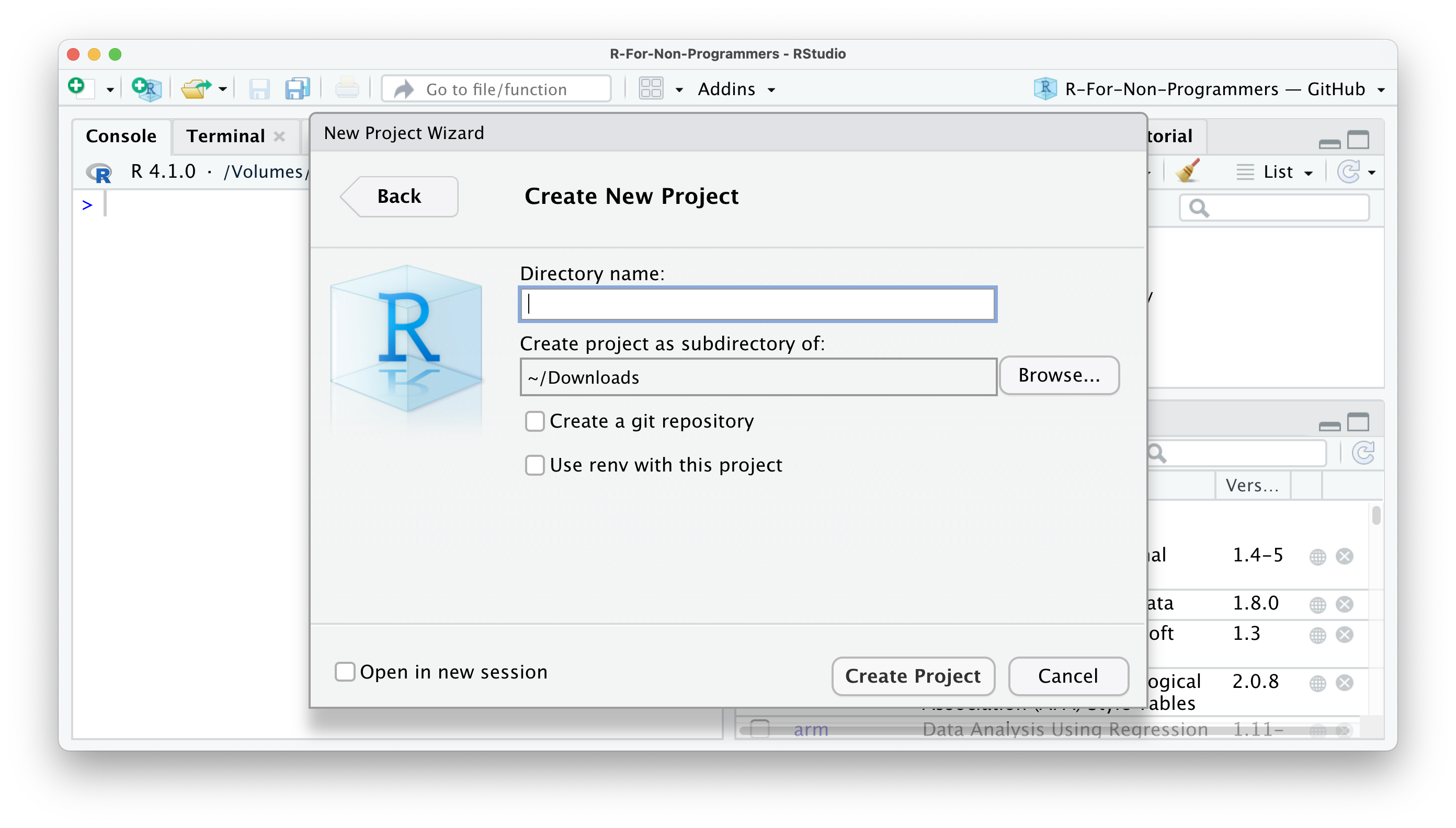 Create a git repository. This is only relevant if you already have a GitHub account and wish to use version control. For now, you can happily ignore it if you do not use GitHub.Lastly, tick