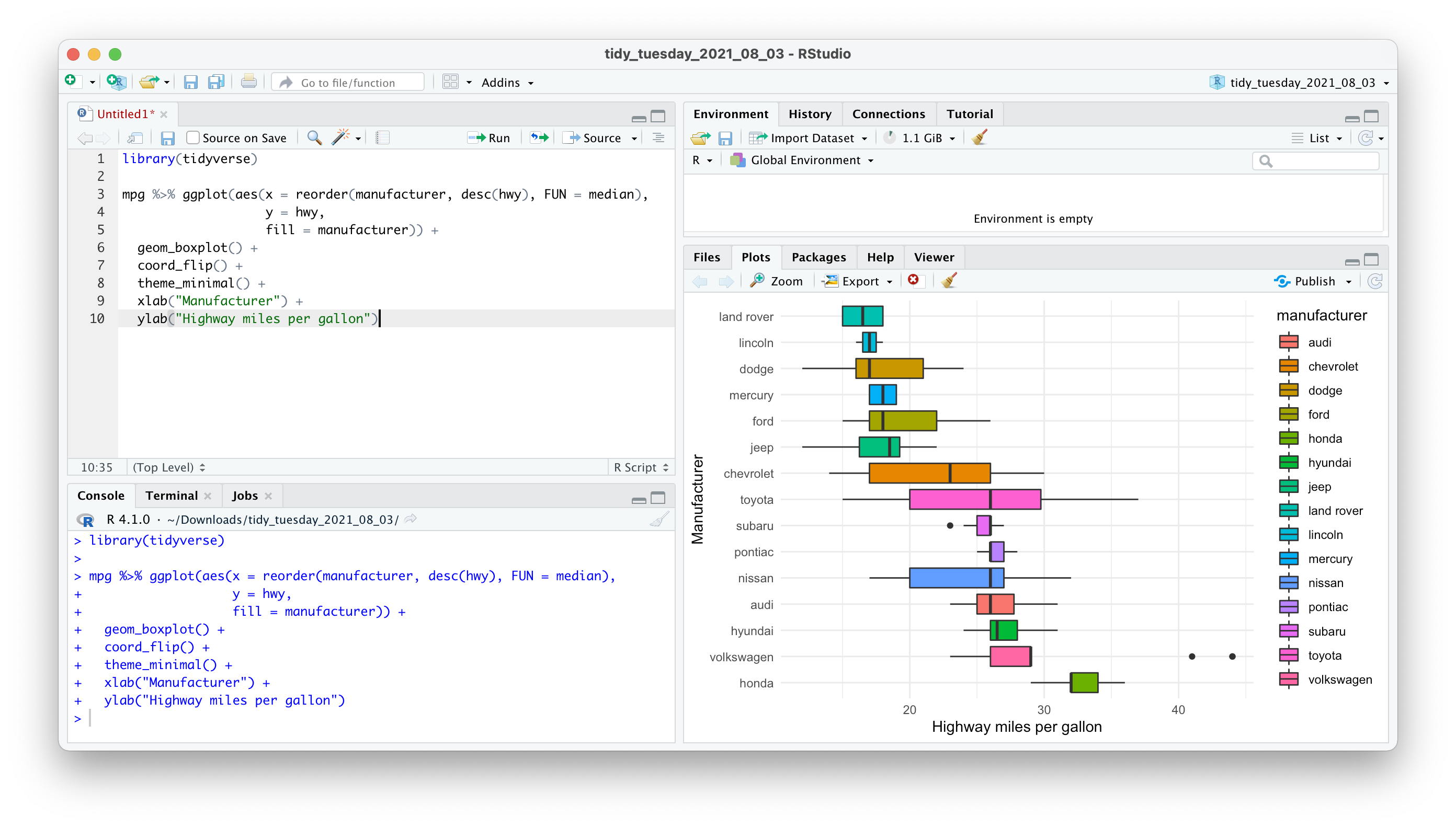 All examples in this book can easily be copied and pasted into your own R script. However, for some code you will have to install the R package r4np (see above). Let’s try it with the following code. The plot this code creates reveals which car manufacturer produces the most efficient cars. Copy and paste this code into your R script.