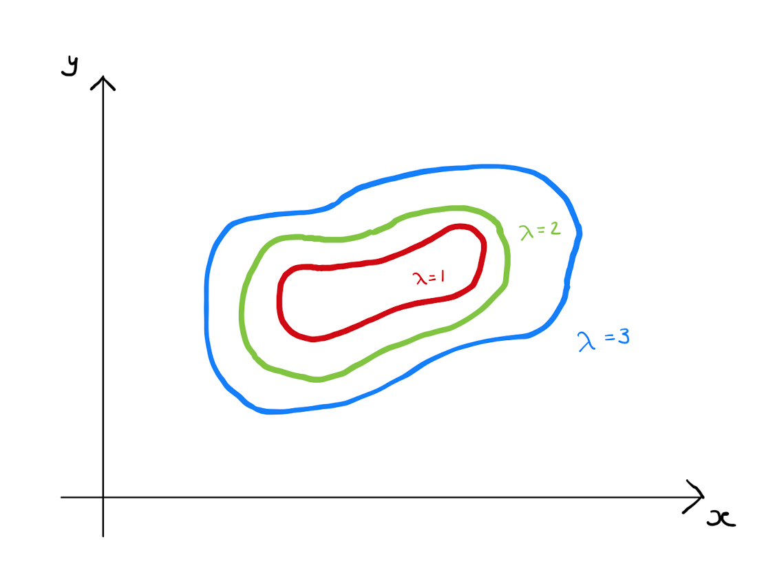 Observe that as \(\lambda\) increases linearly from \(0\), so does the radius of the level curve.