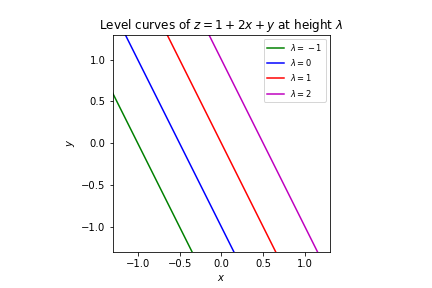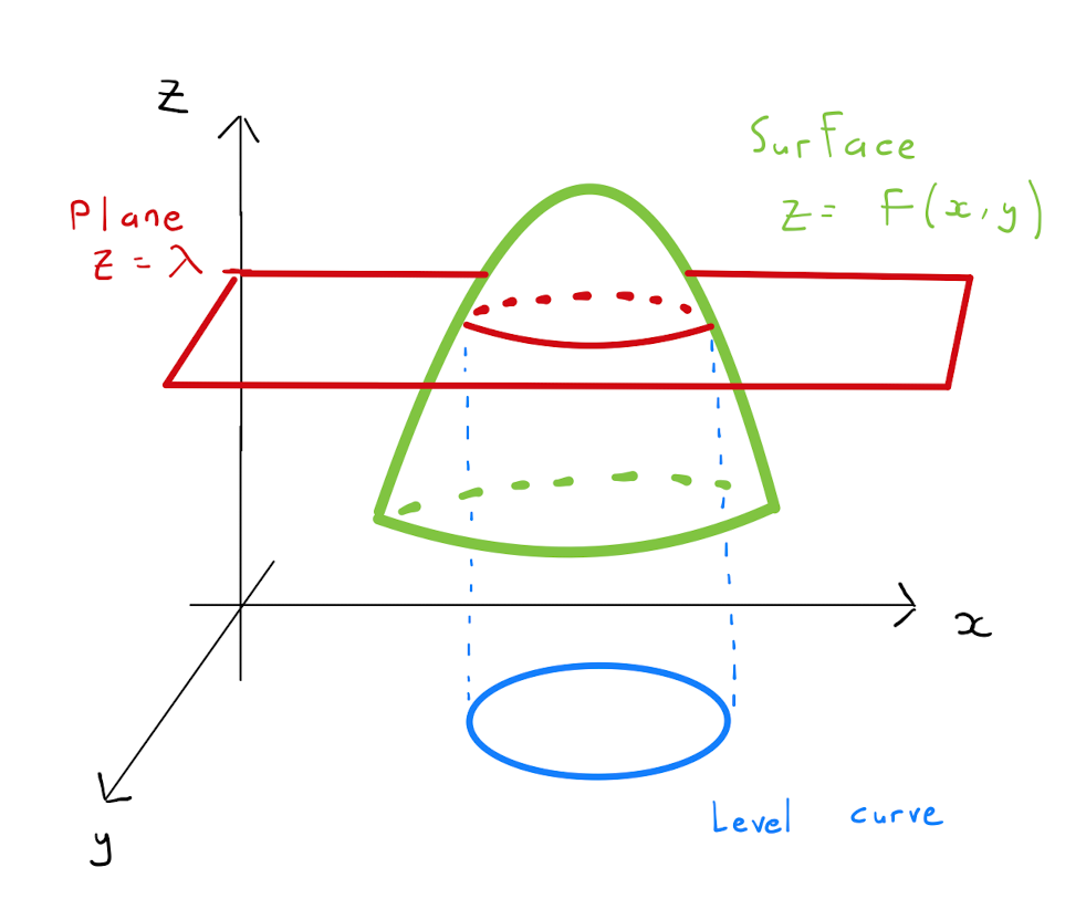 Let \(z=f(x,y)\) be a function of two variables. The level curve of \(f\) at height \(\lambda\) is the set of points defining a curve in \(\mathbb{R}^{2}\), given by \[\left\{ (x,y) \in \mathbb{R}^{2} : f(x,y) = \lambda \right\}.\]