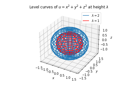 Consider the function \(u = f(x,y,z) = x^2+y^2+z^2\). The level surface of \(f\) at height \(\lambda\) is the set of points \((x,y,z)\) that satisfy: