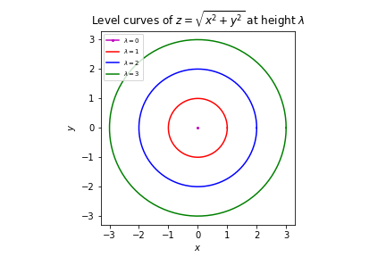 Recall the function \(z = f(x,y) = \sqrt{x^2 + y^2}\) from Example 1.3.3, whose surface is a circlular cone. Then the level curve of \(f\) at height \(\lambda\) is the set of points \((x,y)\) that satisfy: