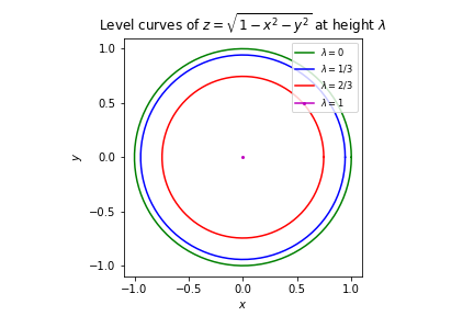Recall the function \(z = f(x,y) = \sqrt{1-x^2 - y^2}\) from Example 1.3.2, the surface of which is a hemisphere. Calculate that the level curve of \(f\) at height \(\lambda>0\) is the set of points \((x,y)\) satisfying