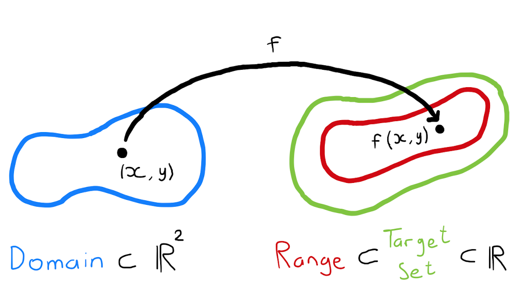 A multivariate function of real variables, denoted \[\begin{align*} f: X &\longrightarrow Y \\ x = (x_1, \ldots, x_n) &\longmapsto y = f(x_1,x_2, \ldots, x_n) \end{align*}\] is a rule that assigns to each element in \(X\) exactly one element in \(Y\), where \(X \subseteq \mathbb{R}^{n}\) and \(Y \subseteq \mathbb{R}\) with \(n \in \mathbb{Z}_{>1}\).
