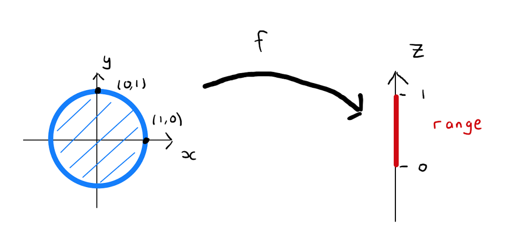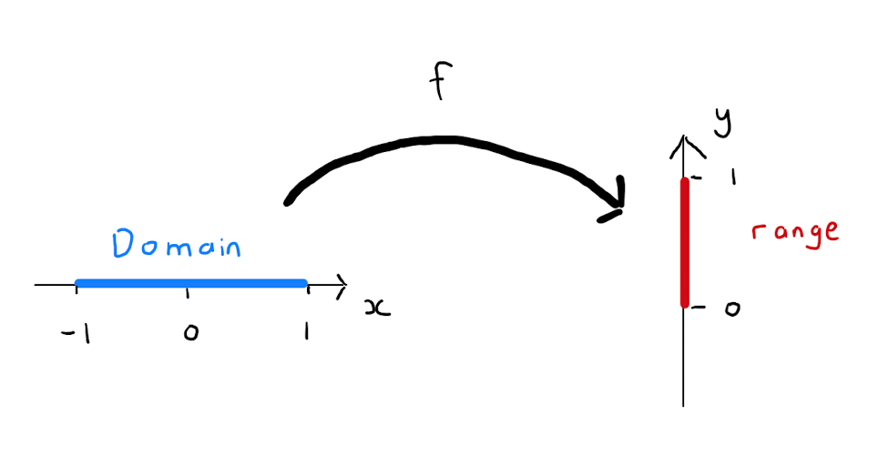 Consider the set \(X = [-1,1] \subset \mathbb{R}\). Define the function \[\begin{align} f: X &\longrightarrow \mathbb{R}, \\ f(x) &= \sqrt{1 - x^2}. \end{align}\] The domain of \(f\) is given by \([-1,1]\). The target set of \(f\) is \(\mathbb{R}\). The range of \(f\) is \([0,1]\).