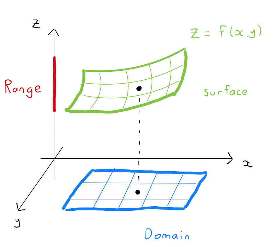 Each point \((x_0, y_0)\) in the domain of \(f\), uniquely corresponds to a point \(\left( x_0,y_0, f(x_0,y_0)\right)\) on the surface.