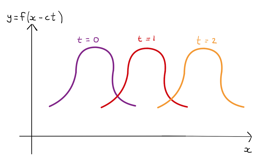The solution \(u(x,t)\) to the wave equation \(u_{tt} = c^2 u_{xx}\) is of the form \[u(x,t)=f(x-ct) + g(x+ct)\] where \(f\) and \(g\) are some general functions.