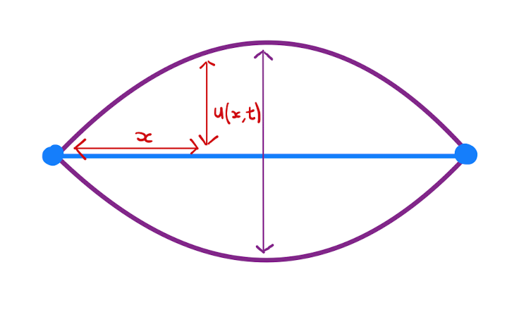 - Consider a horizontal vibrating string that is fixed at both ends. Let \(t\) represent time, \(x\) represent a distance along the string, and \(u(x,t)\) be the vertical displacement of the point \(x\) at time \(t\). Then \(u(x,t)\) satisfies the wave equation.