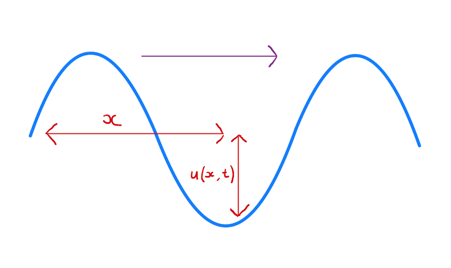 - Consider a wave of water travelling along a cross section of a body of water. Let \(t\) represent time, \(x\) represent a point along the cross section, and \(u(x,t)\) be the sea level at the point \(x\) at time \(t\). Then \(u(x,t)\) satisfies the wave equation.