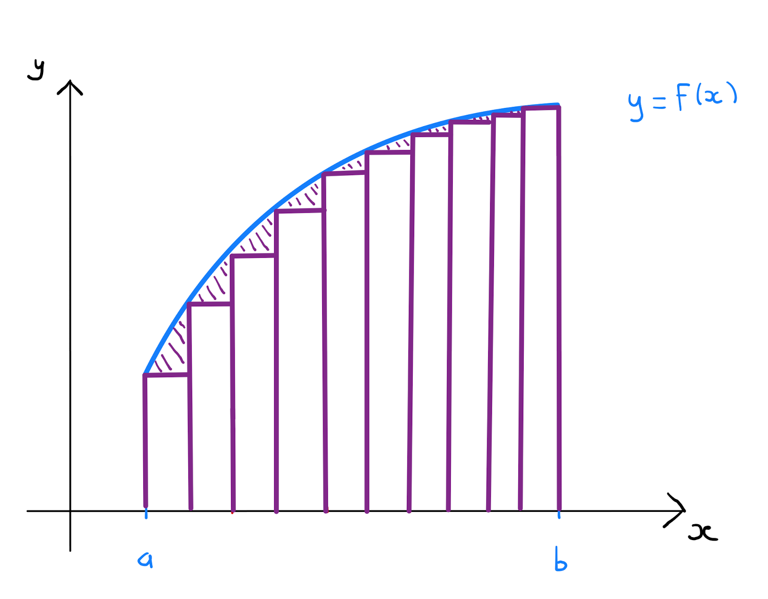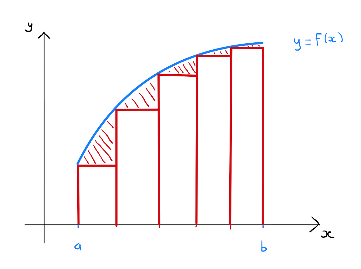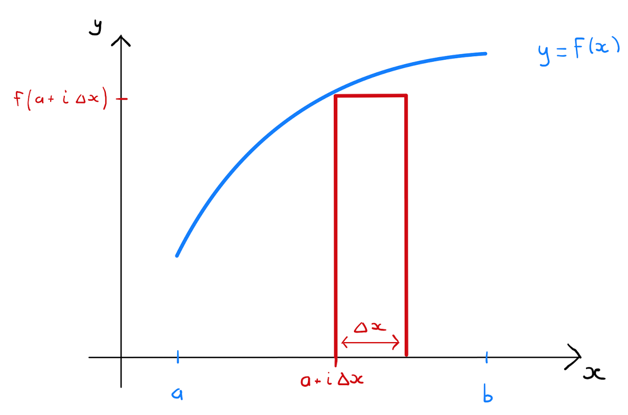 By summing over all sub-intervals, that is \(\sum\limits_{i=0}^{\frac{b-a}{\Delta x}-1} f(a+i\Delta x) \cdot \Delta x\), one obtains an approximation of the area under the curve \(y=f(x)\) over the entirety of the interval \([a,b]\).