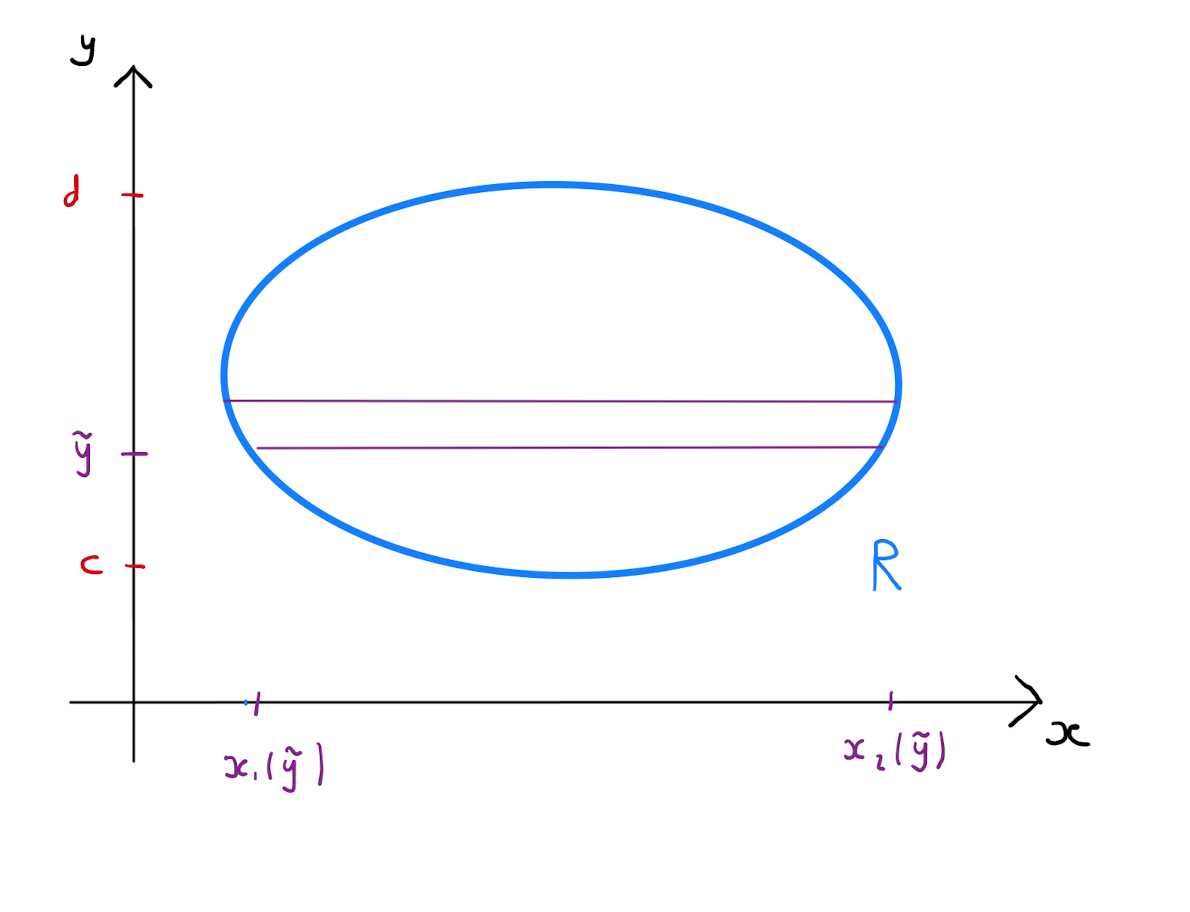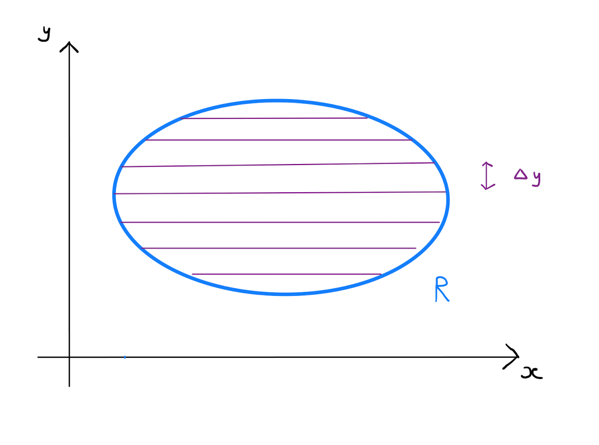 Define \(x_1(\tilde{y})\) as the function that returns the smallest value that the \(x\)-coordinate takes over all the points in \(R\) with \(y\)-coordinate equal to \(\tilde{y}\). Similarly define \(x_2(\tilde{y})\) as the function that returns the largest value taken by the \(x\)-coordinate over all the points in \(R\) with \(y\)-coordinate equal to \(\tilde{y}\). It follows that the integral over a typical strip whose baseline has \(y\)-coordinate \(\tilde{y}\) is approximated by \[\int \int_{\text{strip}} f(x,y) \,dx \,dy \approx \Delta y \int_{x_1(\tilde{y})}^{x_2(\tilde{y})} f(x,\tilde{y}) \,dx.\]