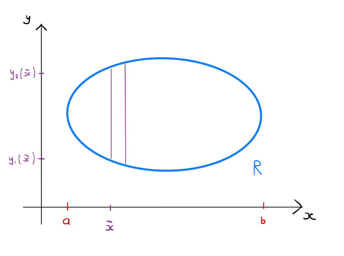 Define \(y_1(\tilde{x})\) as the function that returns the smallest value that \(y\)-coordinate takes over all points in \(R\) with \(x\)-coordinate equal to \(\tilde{x}\). Similarly define \(y_2(\tilde{x})\) as the function that returns the largest value taken by the \(y\)-coordinate over all the points in \(R\) with \(x\)-coordinate equal to \(\tilde{x}\). It follows that the integral over a typical strip bound on the left by the line \(x=\tilde{x}\) is approximated by