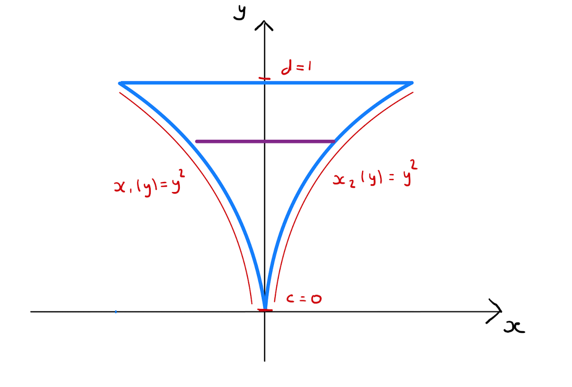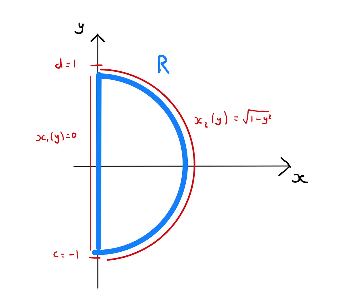 Observe that \(c=-1, d=1, x_1(y)=0\) and \(x_2(y)= \sqrt{1-y^2}\). So calculate that