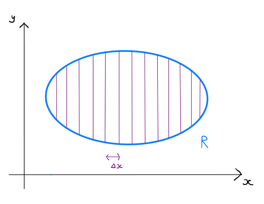 Specifically let \(a\) be the smallest value that the \(x\)-coordinate takes over the two-dimensional region \(R\subseteq \mathbb{R}^{2}\). Similarly let \(b\) be the largest value that the \(x\)-coordinate takes over \(R\). Divide the region \(R\) into a collection of \(n\) vertical strips each width \(\Delta x = \frac{b-a}{n}\). The integral of \(f\) over the whole of \(R\) is equal to the sum of the integral over each strip.