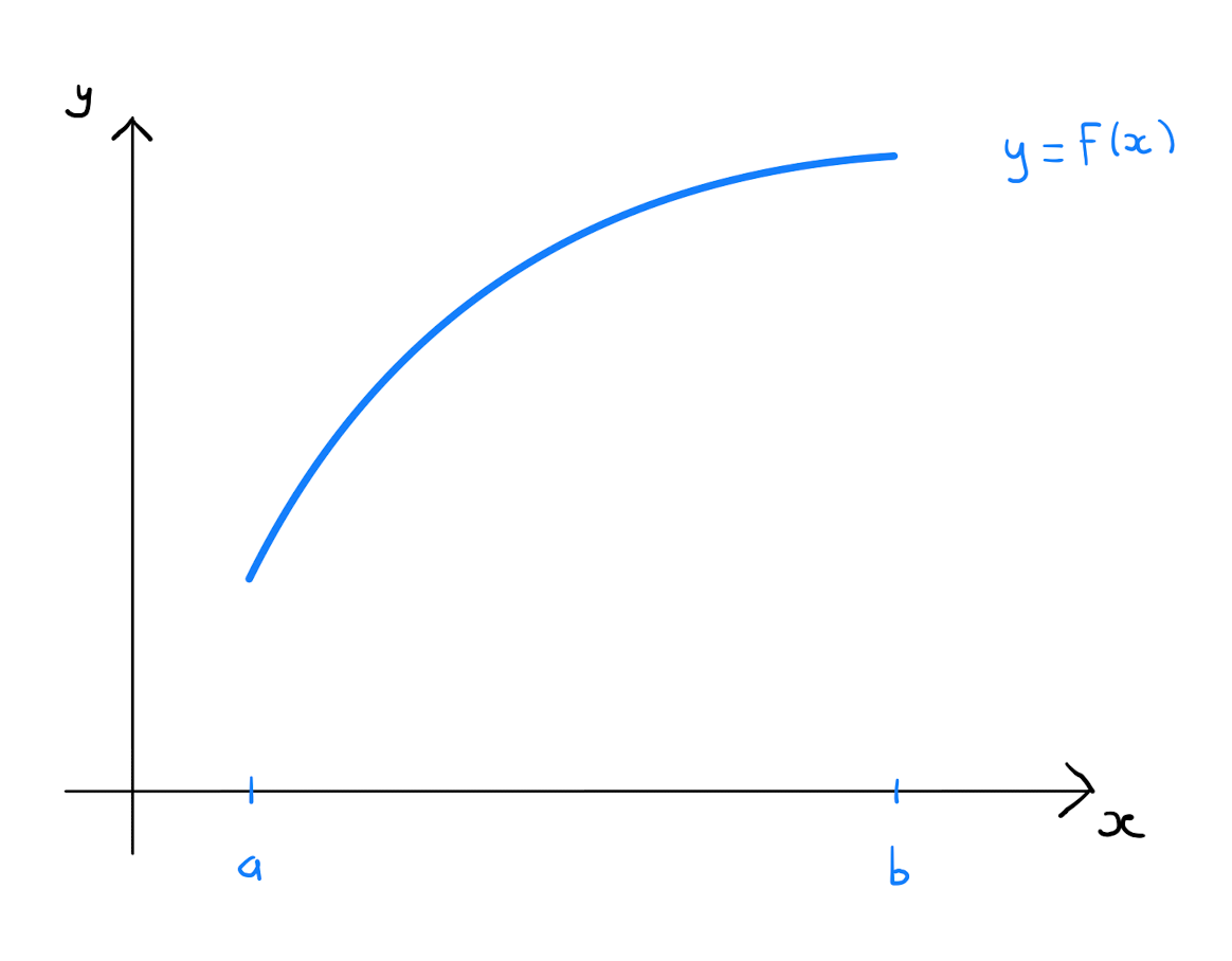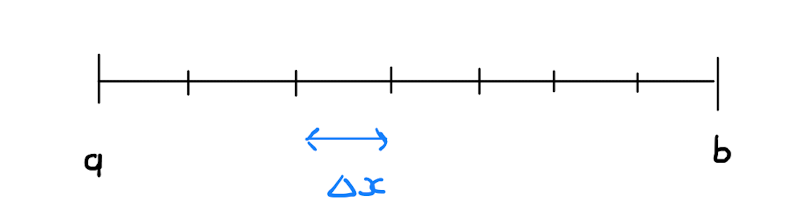 First let \(\Delta x \geq 0\) be a sufficiently small real value such that \(n= \frac{b-a}{\Delta x} \in \mathbb{Z}\). Divide the interval \([a,b]\) into \(n\) sub-intervals. Specifically these sub-intervals are of the form: