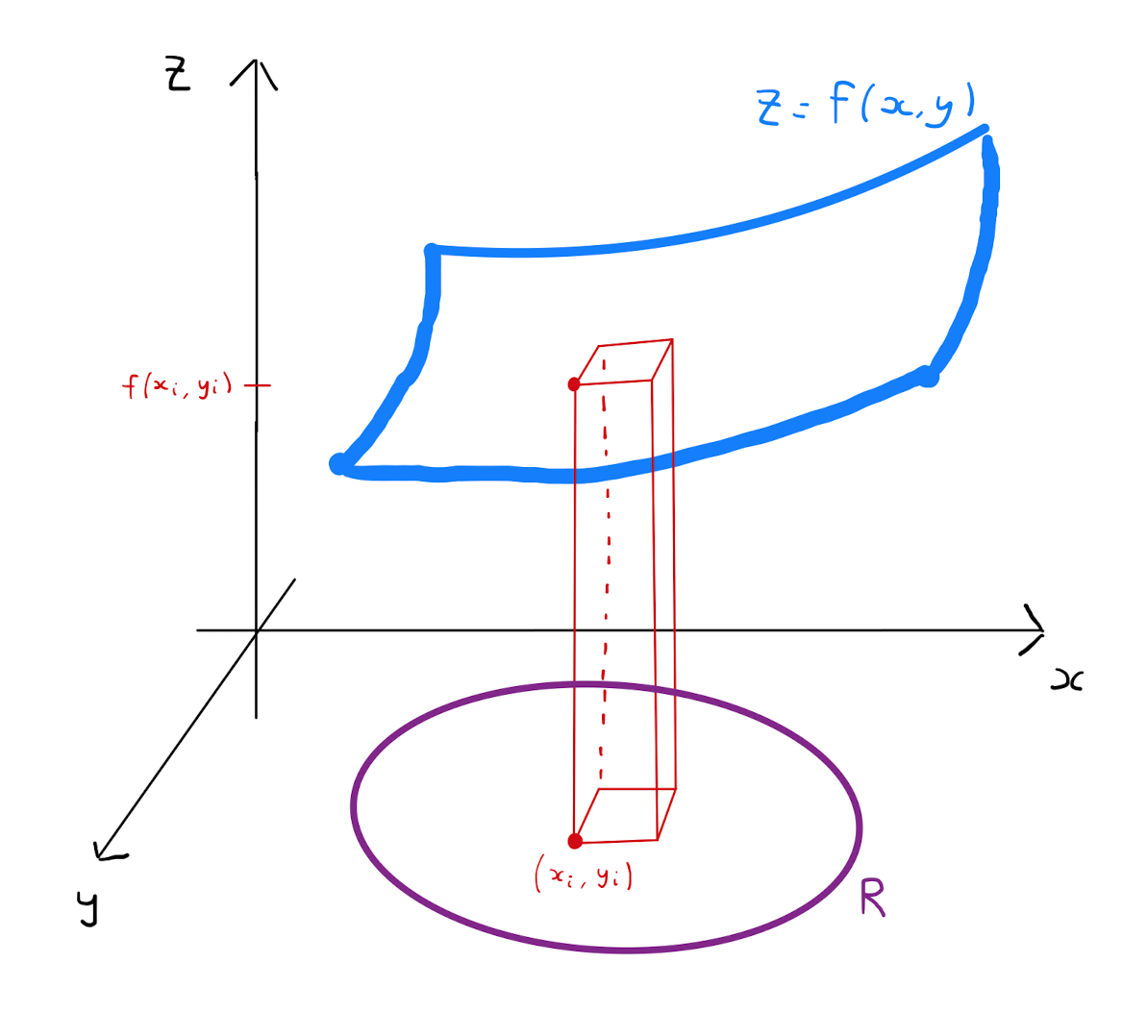 Enumerate the rectangles with labels \(R_1, \ldots R_n\). Rectangle \(R_i\) will have vertices \(\left( x_i, y_i \right)\), \(\left( x_i + \Delta x, y_i \right)\), \(\left( x_i, y_i + \Delta y \right)\) and \(\left( x_i + \Delta x, y_i + \Delta y \right)\) for some \(x_i,y_i \in \mathbb{R}\). For the rectangle \(R_i\) form the product \(f(x_i, y_i) \cdot \Delta x \Delta y\). This expression is the area of a cuboid that approximates the volume under the surface \(z=f(x,y)\) over the rectangle \(R_i\).