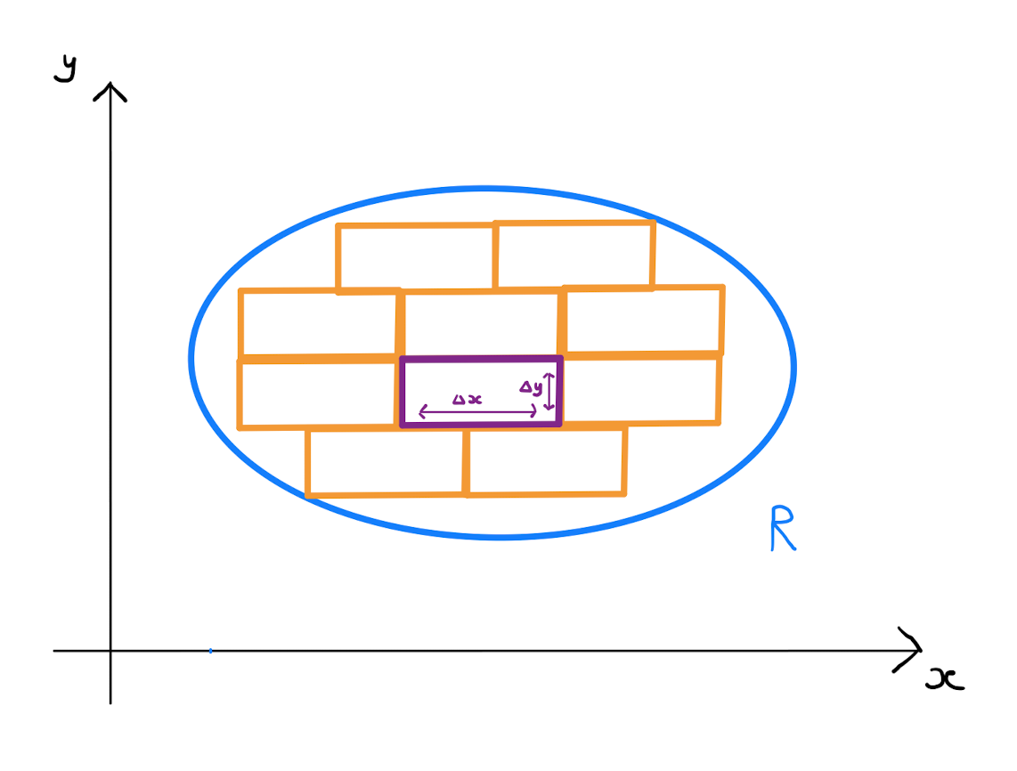 Let \(\Delta x\) and \(\Delta y\) be two sufficiently small real values. Consider a rectangle in the \((x,y)\)-plane with a side of length \(\Delta x\) parallel to the \(x\)-axis, and a side of length \(\Delta y\) parallel to the \(y\)-axis. Fill \(R\) as much as possible with such rectangles. Note \(R\) may have curved boundaries, and so this packing process would not cover \(R\) exactly.