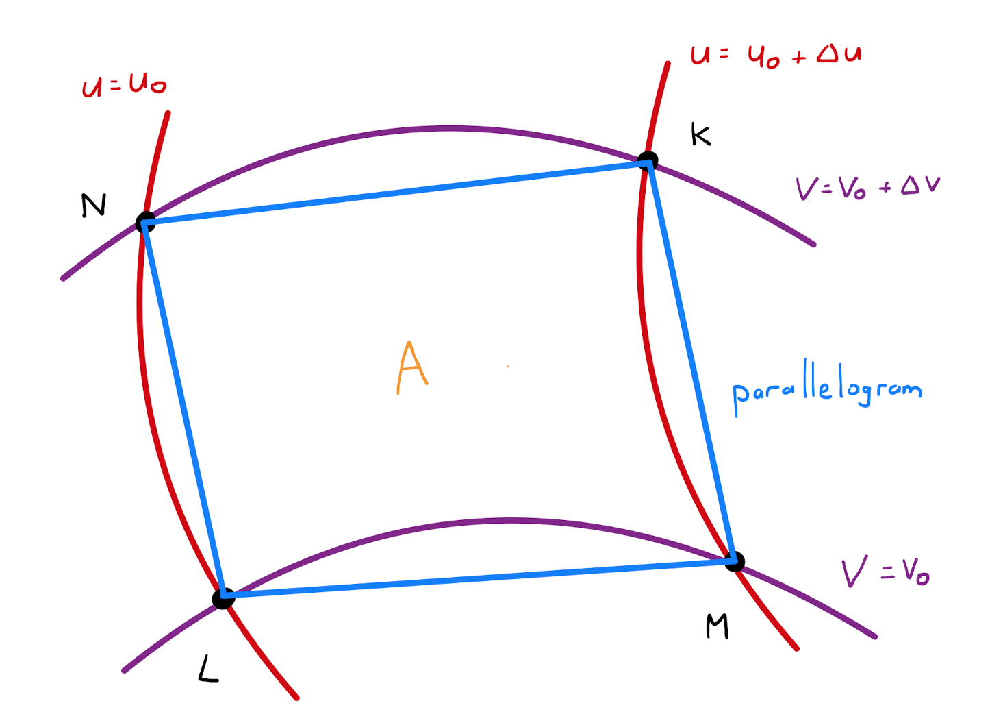 Formally, defining a parametrisation \(\mathbf{r}(u,v) = \left( x(u,v), y(u,v) \right)\), then the region \(A\) is approximated by the parallelogram with vertices: