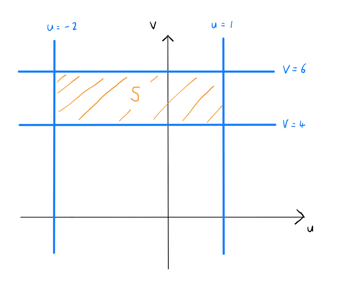 Using the notation from the previous section, the small area \(\Delta A\) in \(R\) was the result of small changes \(\Delta u\) and \(\Delta v\) to \(u\) and \(v\), and therefore corresponds to a small area \(\Delta u \Delta v\) in \(S\). In particular: