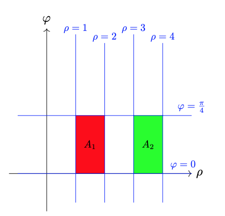 Consider the regions \(A_{1},A_{2}\) in the \((\rho,\varphi)\)-plane, and the regions \(A_{3},A_{4}\) in the \((x,y)\)-plane, as depicted: