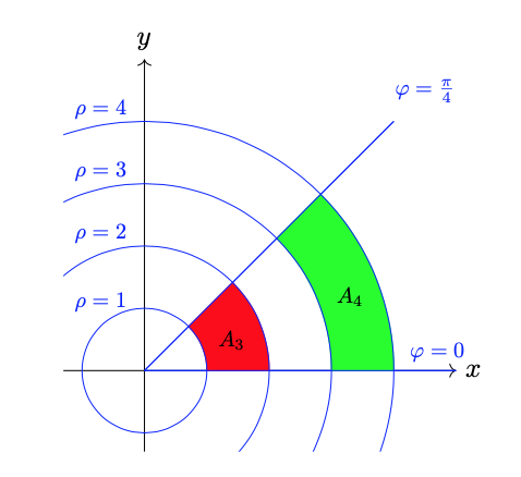 Also note \(A_{4}\) is the image of \(A_{2}\) under the polar coordinate transformation. Consider the ratio of \(A_{4}\) to \(A_{2}\): \[\frac{A_{4}}{A_{2}} = \frac{\frac{7 \pi}{8}}{\frac{\pi}{4}} = \frac{7}{2}.\] The value \(\frac{7}{2}\) is the average value taken by the Jacobian \(\frac{\partial(x,y)}{\partial(\rho, \varphi)} =\rho\) over the region \(A_{2}\).