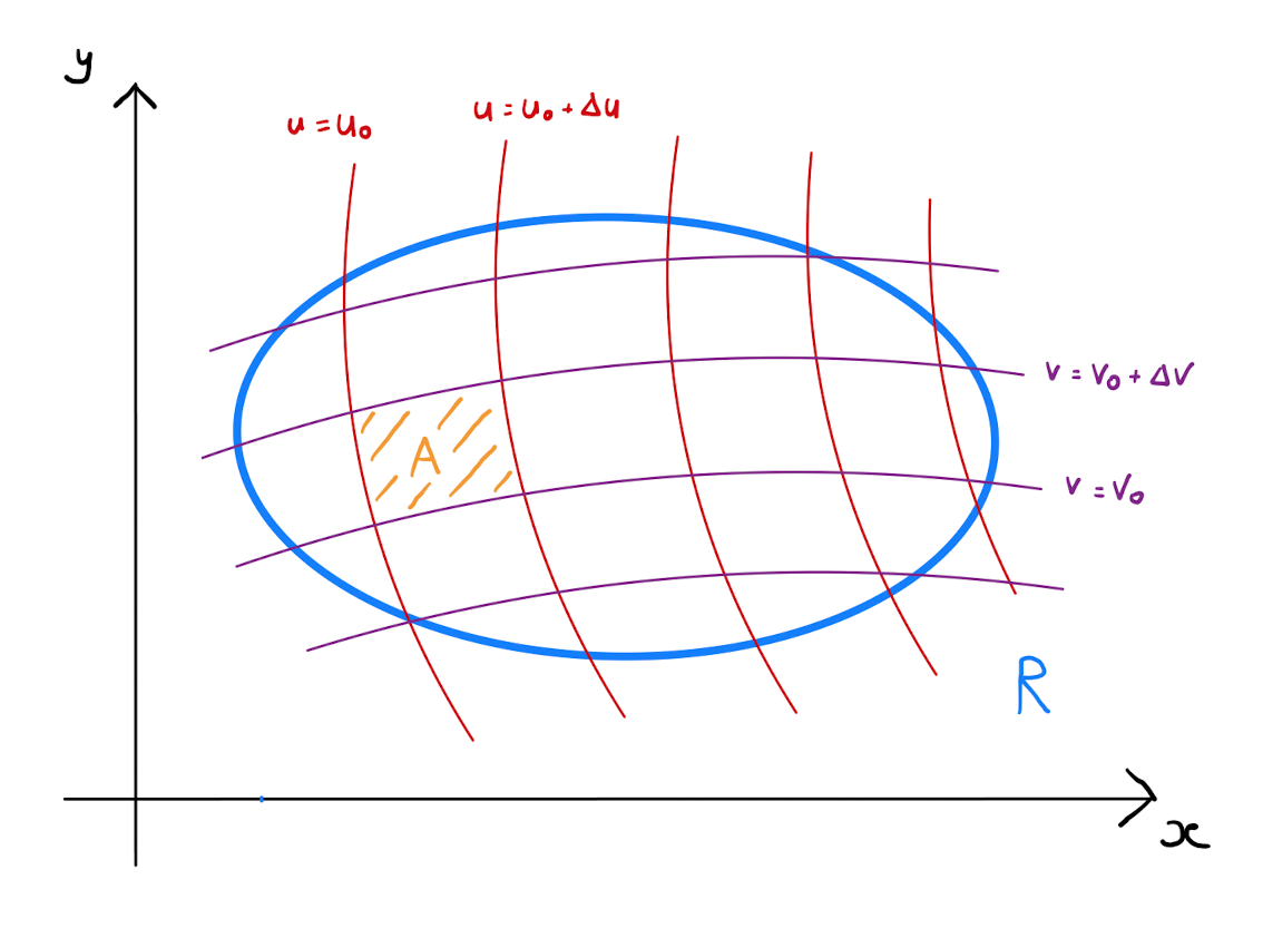 Consider a subdivision of \(R\) into small areas defined by families of the level curves of \(u(x,y)\) and \(v(x,y)\). Specifically fix two small positive values \(\Delta u\) and \(\Delta v\). Further fix values \(u_0,v_0\), and consider the area \(A\) bounded by the lines \(u(x,y)=u_0\), \(u(x,y)=u_0 + \Delta u\), \(v(x,y)=v_0\) and \(v(x,y)=v_0 + \Delta v\). Denote the area of \(A\) by \(\Delta A\).