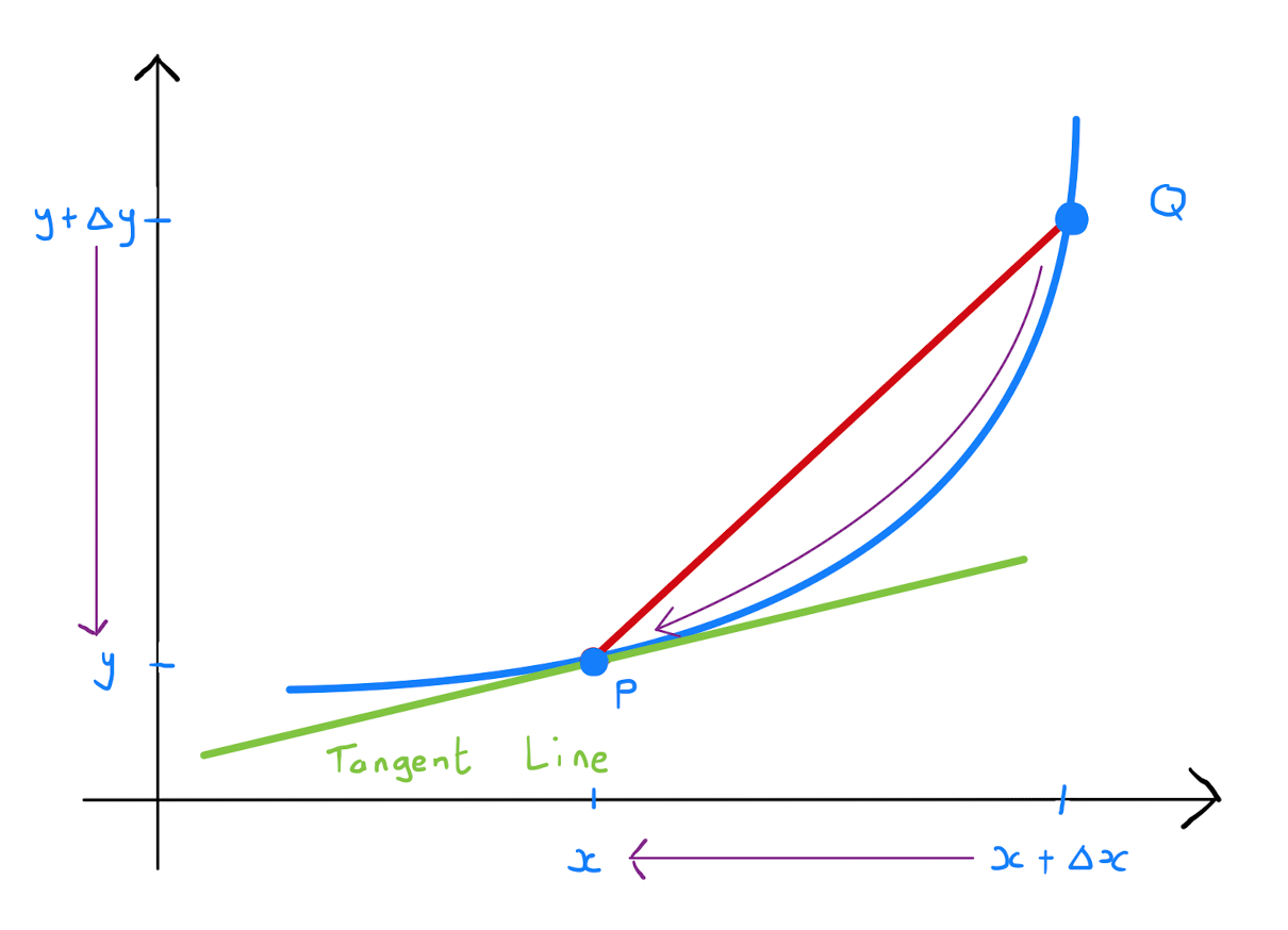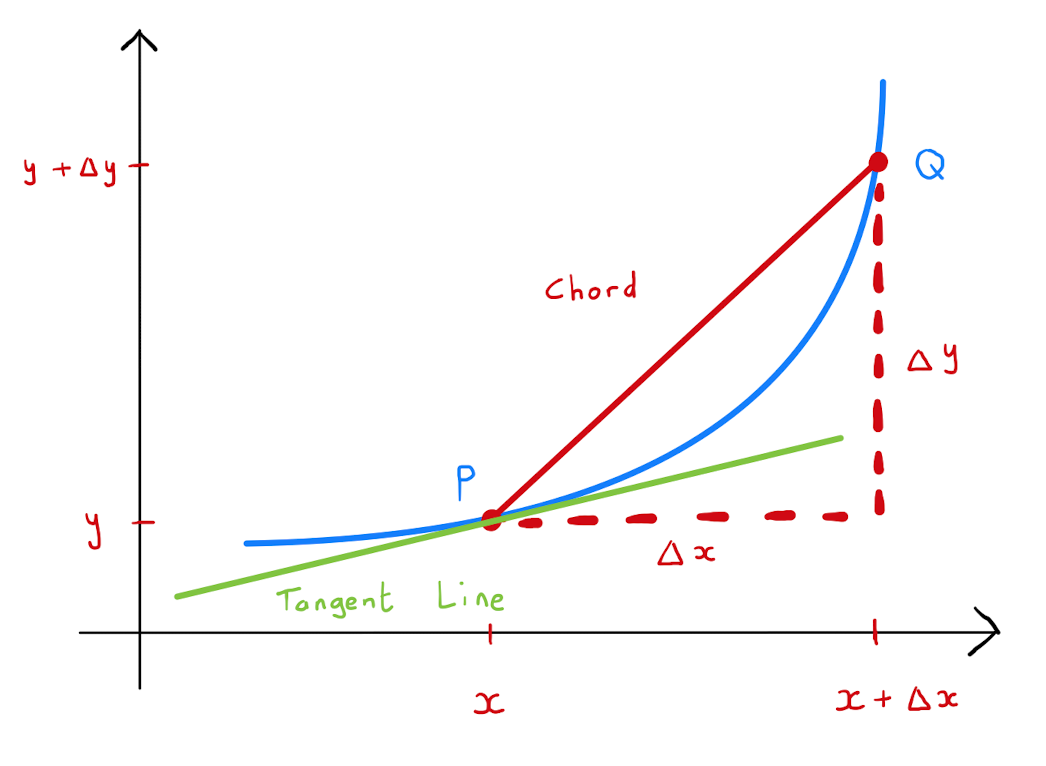 The ratio of \(\Delta y\) to \(\Delta x\) is equal to the gradient of the chord between the points \(P=(x,y)\) and \(Q=(x+\Delta x, y+ \Delta y)\). Provided that \(\Delta x\) is sufficiently small, this chord is ‘close’ to lying on the tangent line at \(P\). Specifically the gradient of the chord \(PQ\) can be approximated by the gradient of the tangent line, which is \(\frac{d y}{dx}\). Written mathematically: \[\begin{align*} \frac{\Delta y}{\Delta x} &= \text{gradient of chord } PQ \\ &\approx \text{gradient of tangent line at } P \\ &= \frac{dy}{dx} \end{align*}\] Rearranging one concludes that the small changes \(\Delta x\) and \(\Delta y\) are related by \[\Delta y \approx \frac{dy}{dx} \Delta x.\]