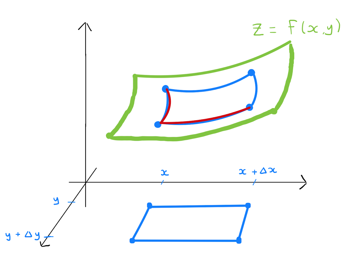 How is this analysis replicated in the case of an implicit function of two variables \(z=z(x,y)\)? Well \(\Delta z\) will be given by the difference between \(z(x,y)\) and \(z(x+\Delta x, y+ \Delta y)\). To investigate this quantity consider the parallogram on the surface \(z = z(x,y)\) whose vertices are given by the points above \((x,y),(x+\Delta x, y),(x, y+ \Delta y)\) and \((x+\Delta x, y+ \Delta y)\).