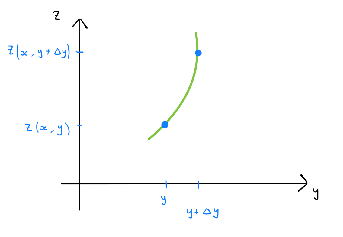 Similarly the expression \(z(x+\Delta x, y+ \Delta y) - z(x+\Delta x, y)\) lends itself to thinking of \(z\) as a univariate function. However before doing so, note that since \(\Delta x\) is sufficiently small, one can approximate the difference \(z(x+\Delta x, y+ \Delta y) - z(x+\Delta x, y)\) by \(z(x, y+ \Delta y) - z(x, y)\).