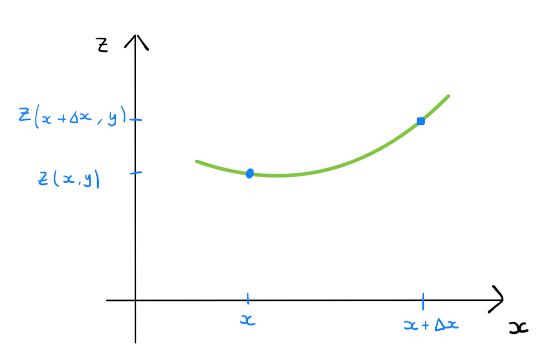 Applying the theory of small changes for univariate functions here gives \[z(x+\Delta x, y) - z(x, y) \approx \Delta x \frac{\partial z}{\partial x}.\]