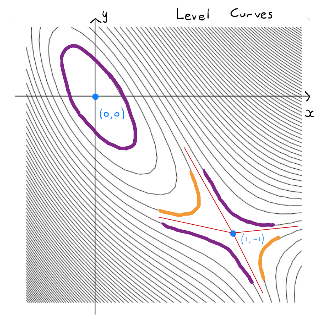 \(H(1,-1) =-36<0, \quad \implies \quad\) the stationary point \((1,-1)\) is a saddle point.
