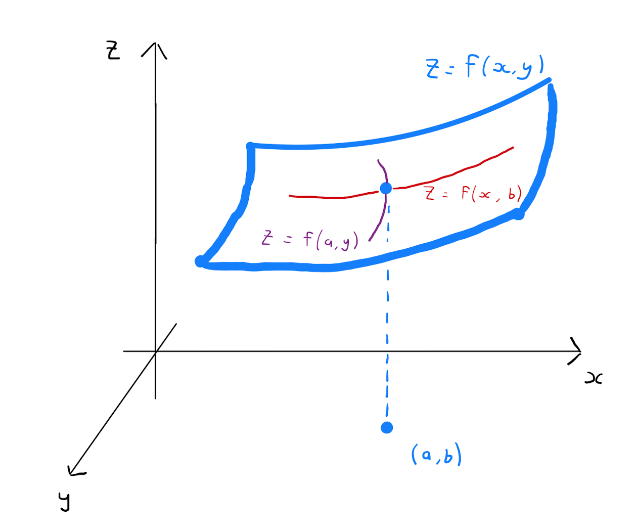 Suppose \((a,b)\) is a stationary point of a function \(f(x,y)\). Graphically one can take two cross-sections of the surface \(z=f(x,y)\) through the planes \(x=a\) and \(y=b\) respectively. This will describes two curves, one given in the \((y,z)\)-plane by the univariate function \(z=f(a,y)\), and the other given in the \((x,z)\)-plane by the univariate function \(z=f(x,b)\).These curves will have stationary points, in the context of univariate functions, at \(y=b\) and \(x=a\) respectively.