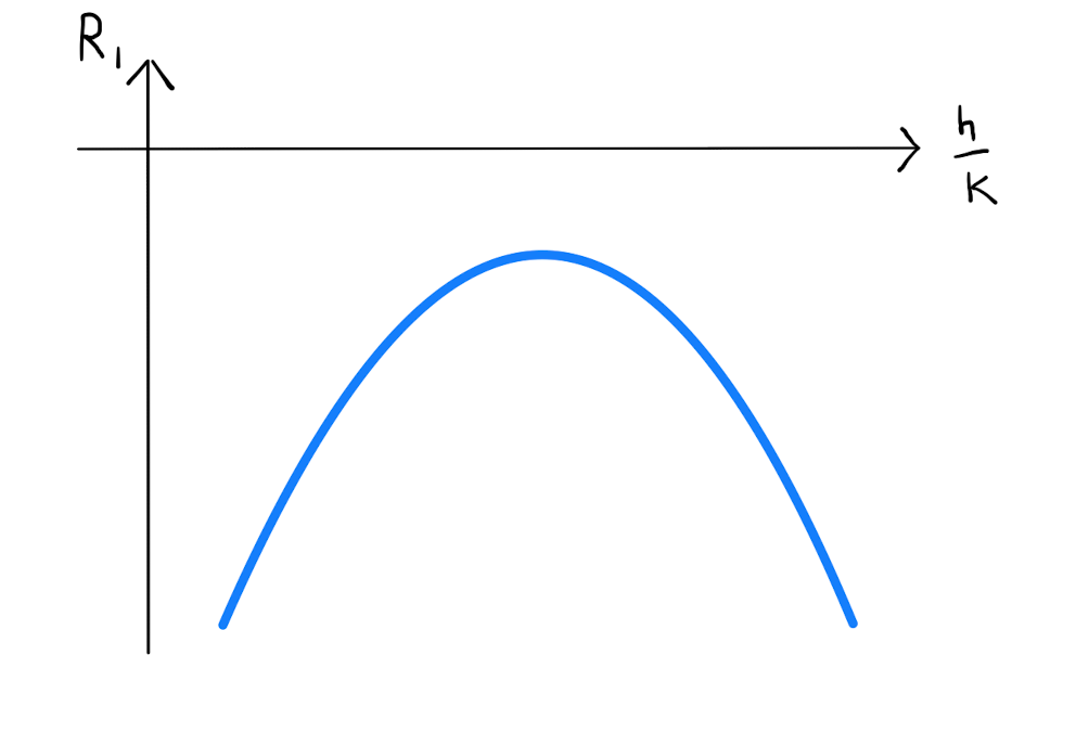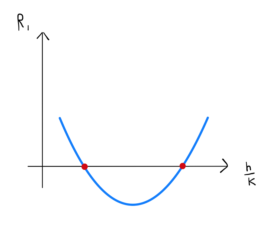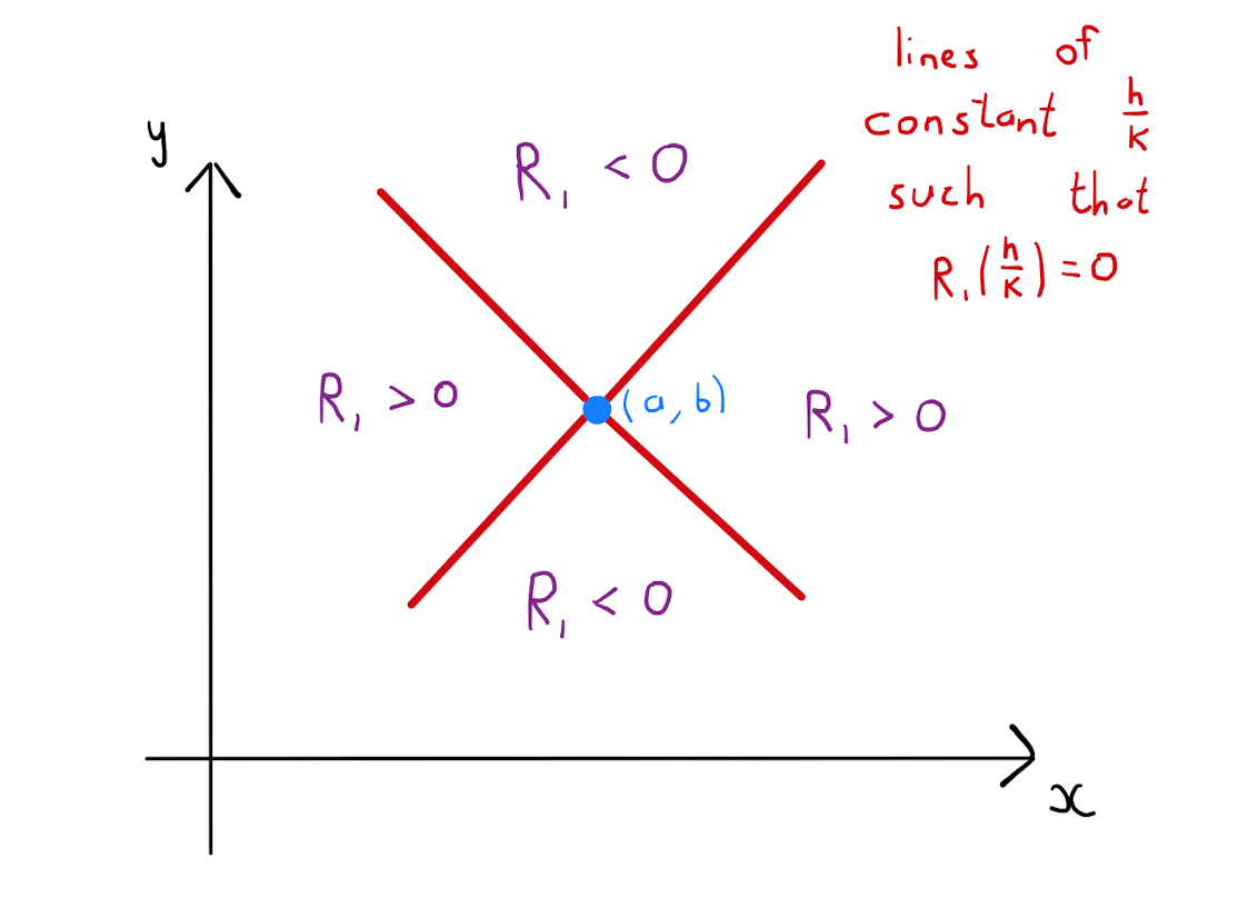 Specifically there are two distinct values for \(\frac{h}{k}\) for which \(R_1=0\). At both of these roots \(R_1\) changes sign, and \((a,b)\) is therefore a saddle point.