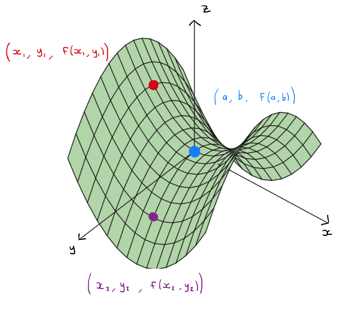 The point \((a,b)\) is a saddle point of \(f\) if for every disc \(D\) with center \((a,b)\) there exists