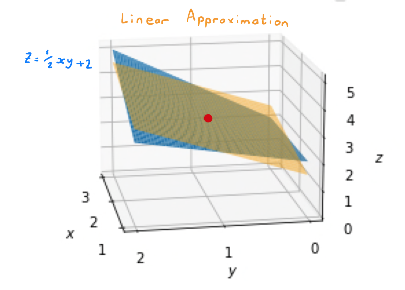 Indeed this linear approximation is one we have already seen in the course. This approximation is essentially the same as the small changes formula \(\Delta f = \frac{\partial f}{\partial x} \Delta x + \frac{\partial f}{\partial y} \Delta y\) that we saw in Section 5.1.
