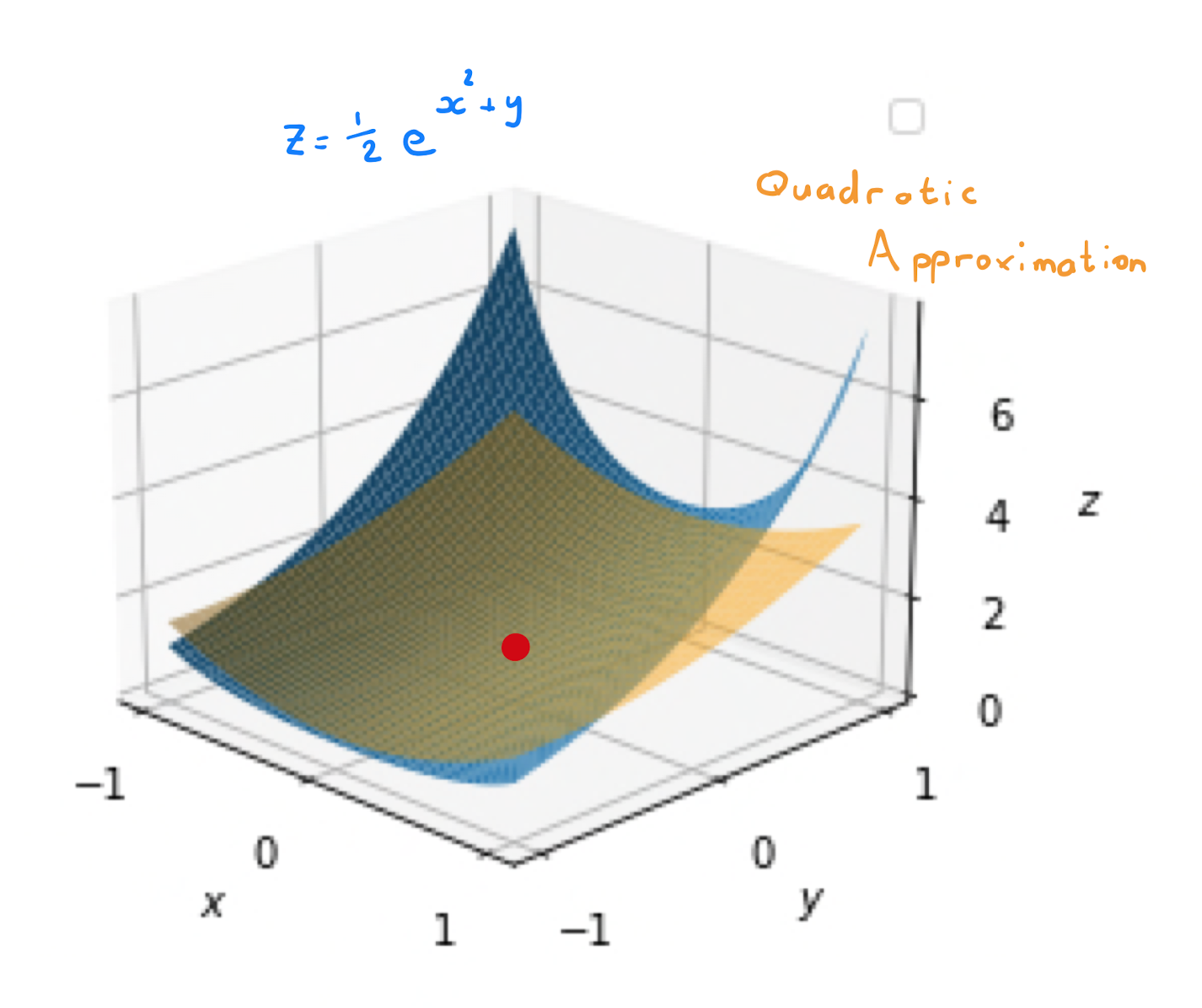 The quadratic approximation of \(f\) obtained through Taylor’s theorem, setting \(a=0, b=0\), is \[\begin{align*} f(x,y) &\approx Q(x,y) \\ &= f(0,0) + xf_x (0,0) + y f_y (0,0) + \frac{1}{2} \Big[ x^2 f_{xx}(0,0) + 2xy f_{xy}(0,0) + f_{yy}(0,0) \Big] \end{align*}\]