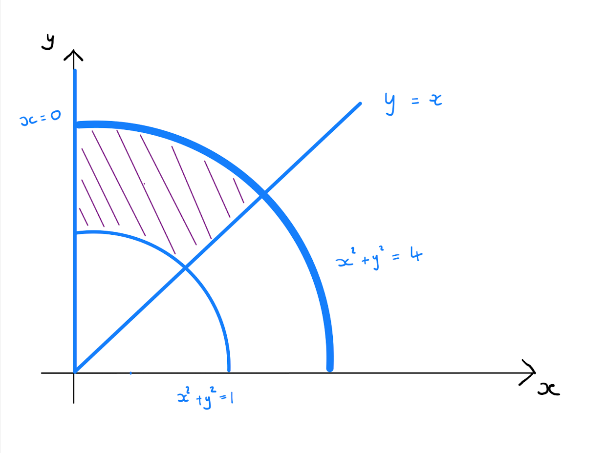 Now looking at the bounding lines of \(D\), and rewriting them in terms of \(\rho, \varphi\) and \(z\) by substitution, one obtains \[\begin{align*} x^2 + y^2 =1 \qquad &\text{becomes} \qquad \rho=1, \\[3pt] x^2 + y^2 =4 \qquad &\text{becomes} \qquad \rho=2, \\[3pt] x=0 \qquad &\text{becomes} \qquad \varphi=\frac{\pi}{2}, \\[3pt] y=x \qquad &\text{becomes} \qquad \varphi=\frac{\pi}{4}, \\[3pt] z=0 \qquad &\text{becomes} \qquad z=0 \\[3pt] z=1 \qquad &\text{becomes} \qquad z=1. \end{align*}\] Therefore \(D\) can be written as \[D = \left\{ (\rho, \varphi,z): 1\leq \rho \leq 2, \frac{\pi}{4} \leq \varphi \leq \frac{\pi}{2}, 0 \leq z \leq 1 \right\}.\]
