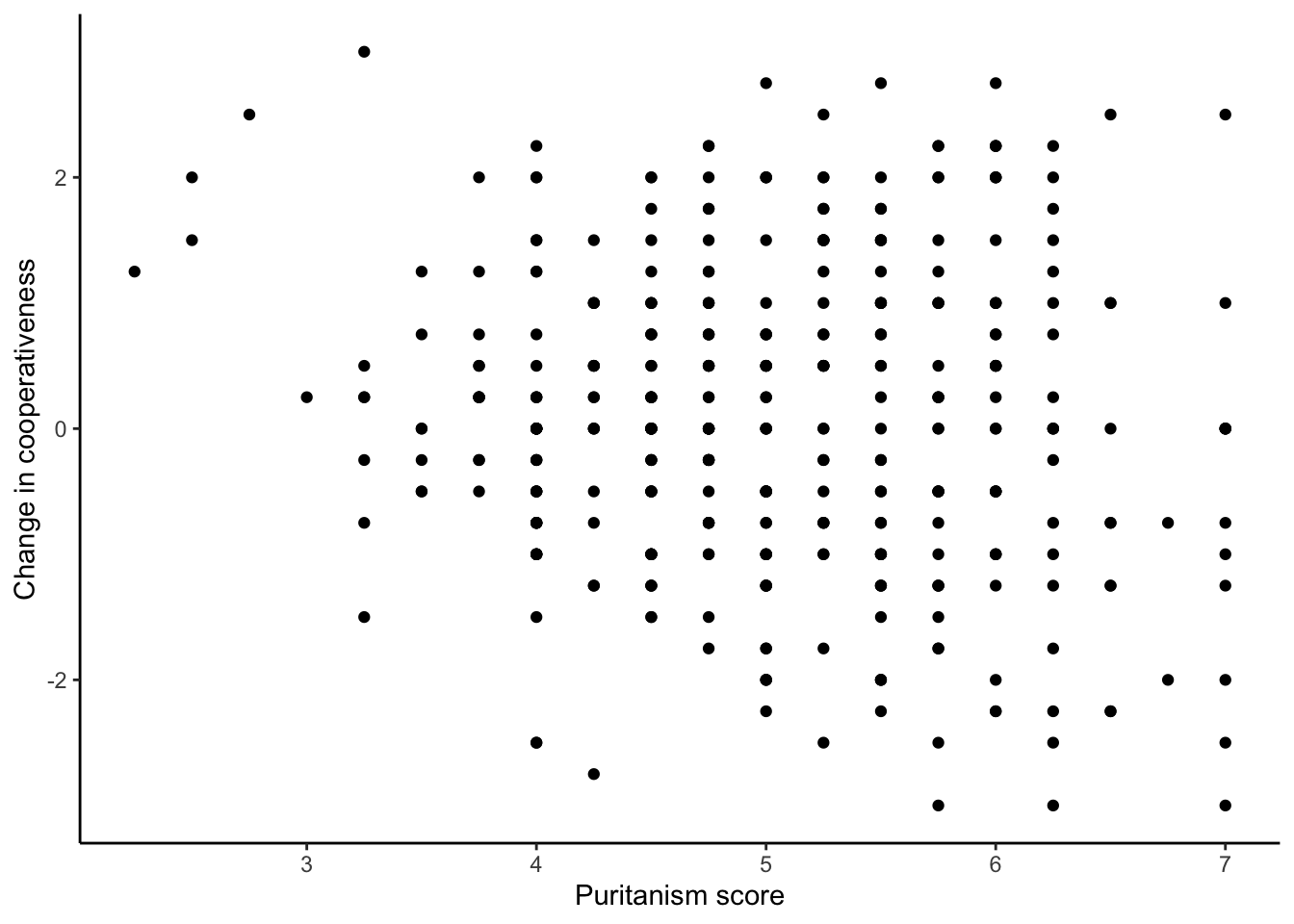 In figure 1, the x-axis was categorical (the two conditions) and the y-axis was continuous. What if we want both axes to represent one continuous variable against another (a scatter plot)? Let’s make figure2, mapping the covariate puritanism_score to the x-axis and coop_score to the y-axis. I have done a few things like set the axis labels and the theme already.