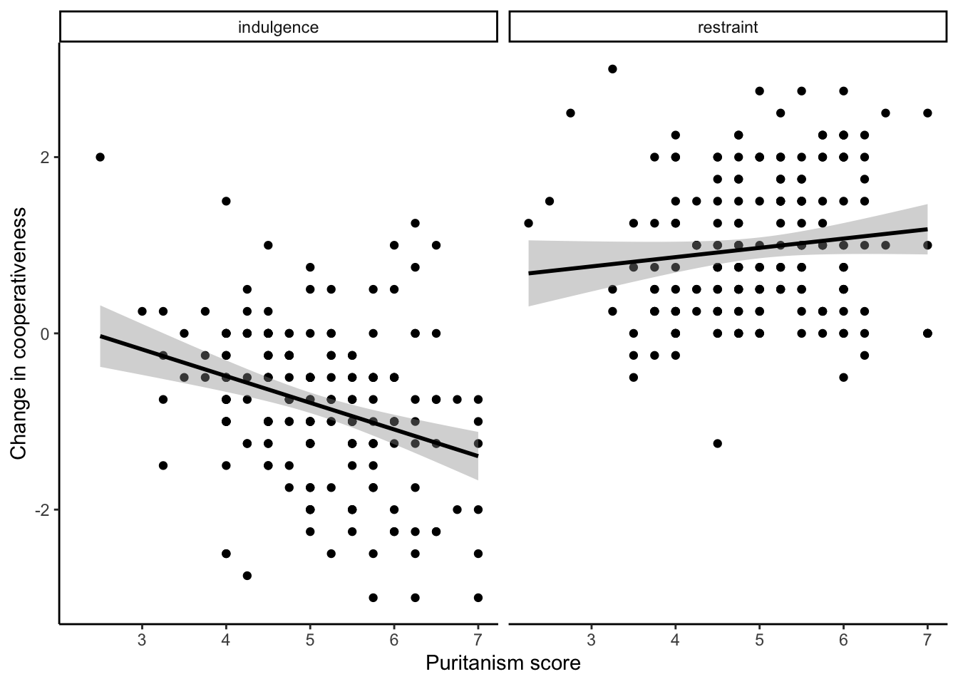 Figure 2 does not so far show that the study had two conditions. Half of the participants were rating coop_score in the indulgence condition, and half in the restraint condition. We know from figure 1 that the scores were pretty different in the two conditions, and so maybe we should indicate on the graph which condition each point comes from. To make the point colour reflect the condition, we need to expand the aesthetic: as well as mapping axes to variables (x to puritanism_score, y to coop_change) we want to make the colour of the points to the variable Condition. Let’s do that: