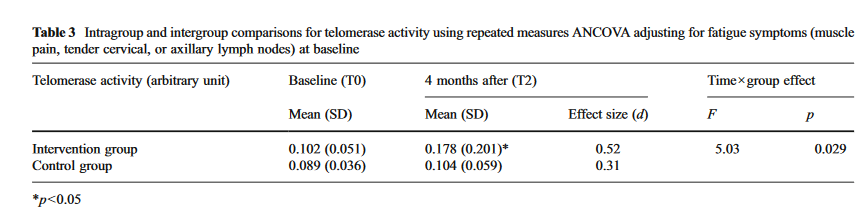 Here, all three studies include a control group who did not do mindfulness meditation and a treatment group who did. They all measured telomerase activity before and after the treatment in both groups. Then they do various statistical tests, not necessarily the same ones. However, all report, in their tables, some descriptive statistics of telomerase activity values in each group after the treatment, and we can make use of these. Let’s have a look at the relevant parts of the papers. Here are the relevant tables from the first two: