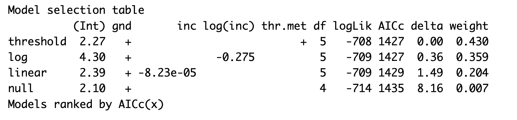 For each model, you can see which variables are included. For the continuous variables, you can see their parameter estimates where they are included; for the categorical ones, there is just a cross. You can see the AIC (column AICc) for each model, and then the AIC weight. The winner is threshold. Not by much, though: an AIC advantage of about 0.4. To put this in context, any models with AICs within 2 units of one another are considered nearly equally well supported. (The absolute value of AIC should not be interpreted - it depends on the values in your dataset - but the difference in AIC between two models of the same outcome, shown in the table as delta, can always be interpreted.) log comes second, and then lin. There is not much difference in AIC to separate them, and the AIC weights reflect this: 0.43 for threshold; 0.36 for log; 0.21 for linear.